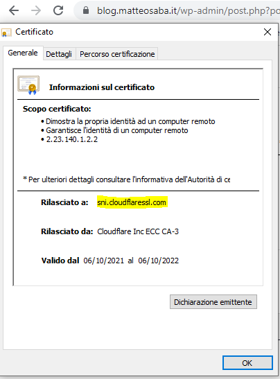 Avrete certamente notato che non è stato rilasciato a *.matteosaba.it ma a sni.cloudflaressl.com.