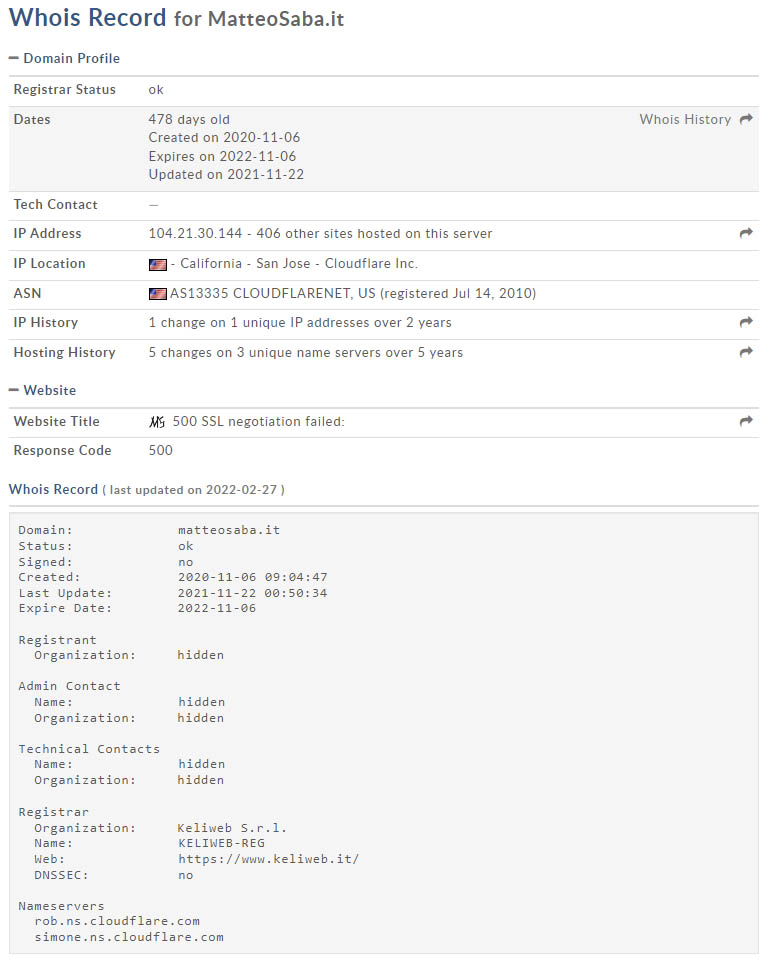 No non è un errore e non ho hackerato il grande database. Semplicemente quando ho registrato “matteosaba.it” presso Keliweb, ho scelto l’opzione per nascondere i dati personali per privacy. Alcuni consentono di farlo per determinate estensioni come i “.it”.