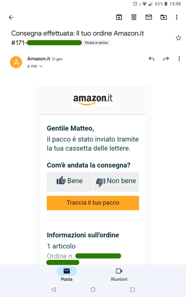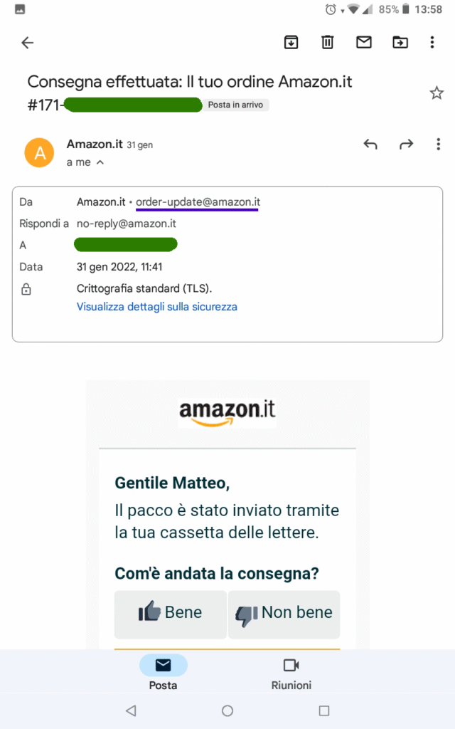 Sappiamo per certo che l’email proviene da amazon.it che è il sito del colosso americano visto il suo dominio.