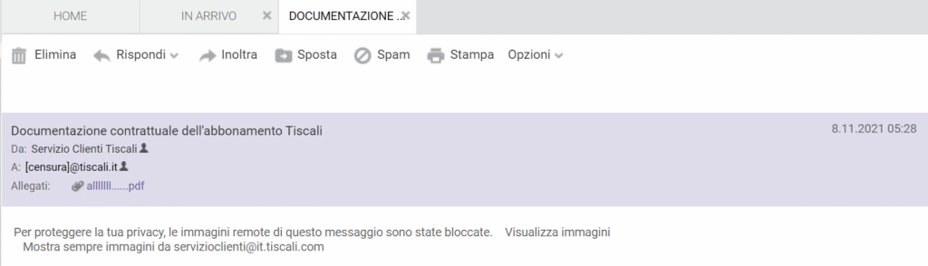 Per vedere da dove arriva l’email bisogna passare sopra con il mouse sul mittente (“Servizio Clienti Tiscali“).